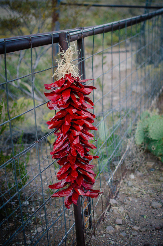 Each Ristra is hand made and painted with every chili specifically bent by hand and painted. Once an order is placed we do not accept returns on these as they are made as orders come in. Turnaround time on all Ristras is 2 weeks not including weekends or holidays. Ristras can be hung indoors or outdoors and are protected from weather and do not rust!